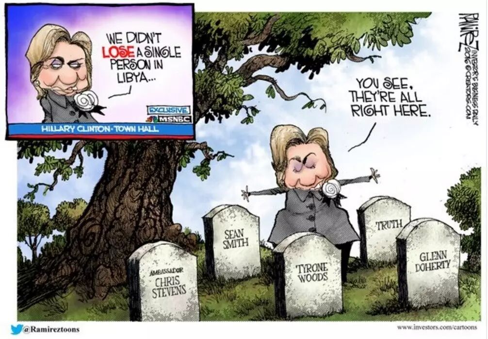 5)班加西惨案:美国驻利比亚班加西的领事馆遭受恐怖袭击,美国驻利比亚大使Etevens等人被杀。女克林顿居然在事先有征兆的情况下不予理睬,事发当时居然不接紧急电话。事后她拒不承认自己的错误。她是国务卿,负责所有的对外事务。她却对自己的属下的安全毫不关心。